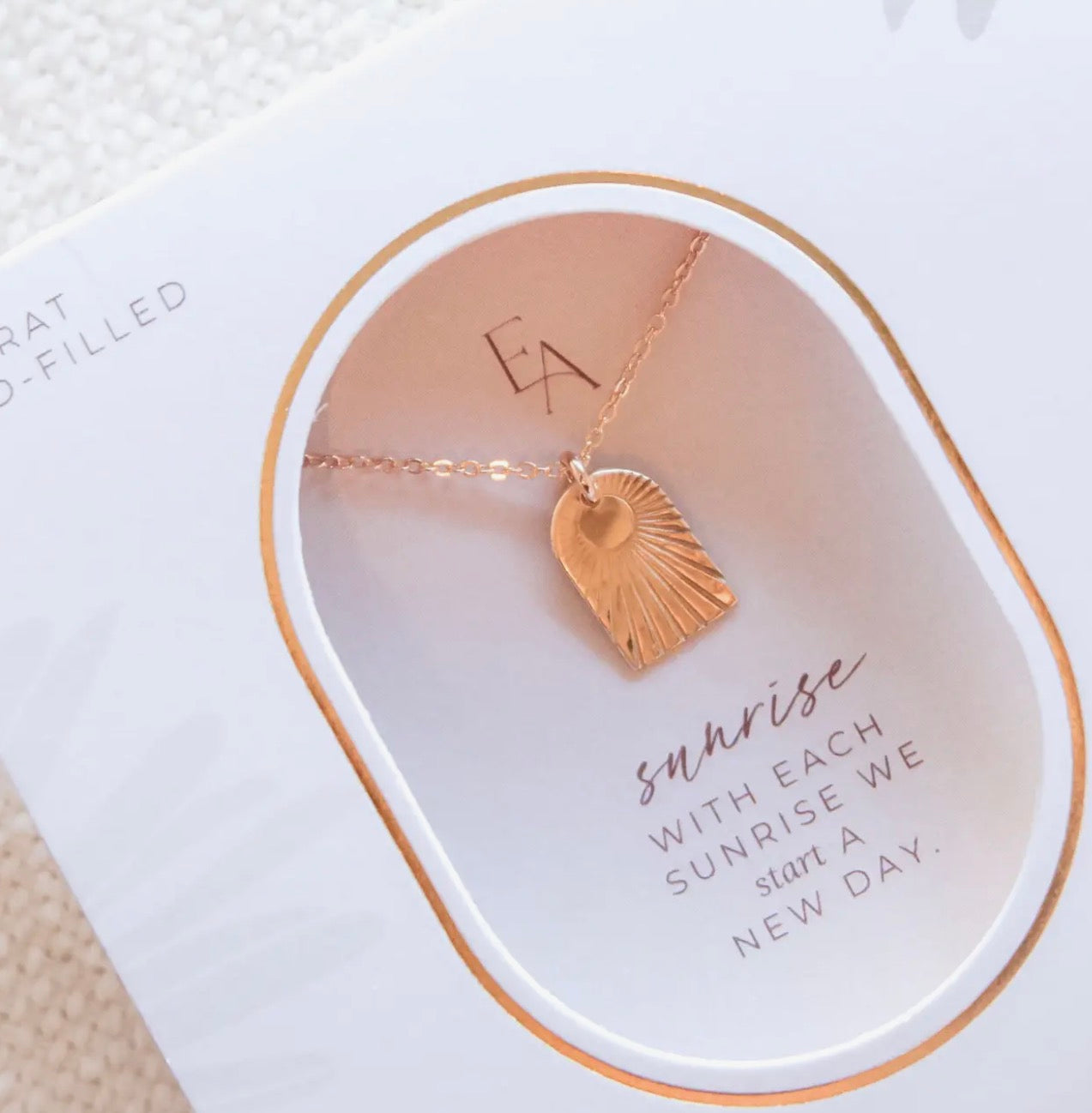 This 14k Gold-Filled Sunrise Necklace features a hand-stamped sunrise design - a symbol of new beginnings and fresh starts. Add this to a Blessing Box as a reminder that "His mercies are new every morning."